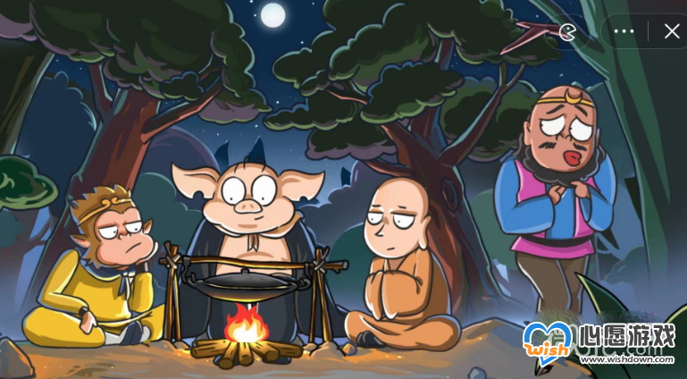 3、影5:点击锅,当沙僧走到画面右上角的褐色树枝底下,点击沙僧。当其他3人头转过去后,立即点击沙僧,再把【影子5拖到沙懂位置