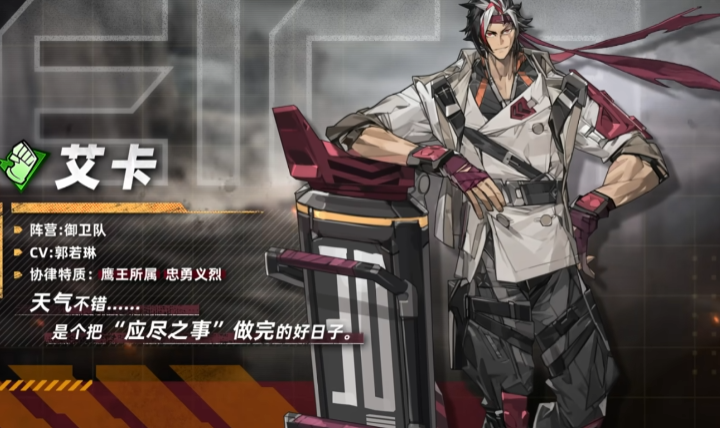 二技能坚韧体魄是艾卡的保命底牌,在技能使用之后可以降低自身受的伤害,如果遇到敌方的围殴,可以凭借这一技能迅速脱离战场,也可以扛着输出继续向敌人攻击,这时队友也可以向自己周边行进,一同对敌人进行反击,艾卡的大招是冲击劲势,这一技能不只是伤害非常高,还可以当成搅局神器使用,在团体战斗的时候,如果击中敌方可以把敌人往后推两格,两格的空间有几率把敌方的阵型打乱,这时队友上前对敌人进行输出,可以更好的攻击敌人,如果身处劣势,这一技能有几率转劣为优。