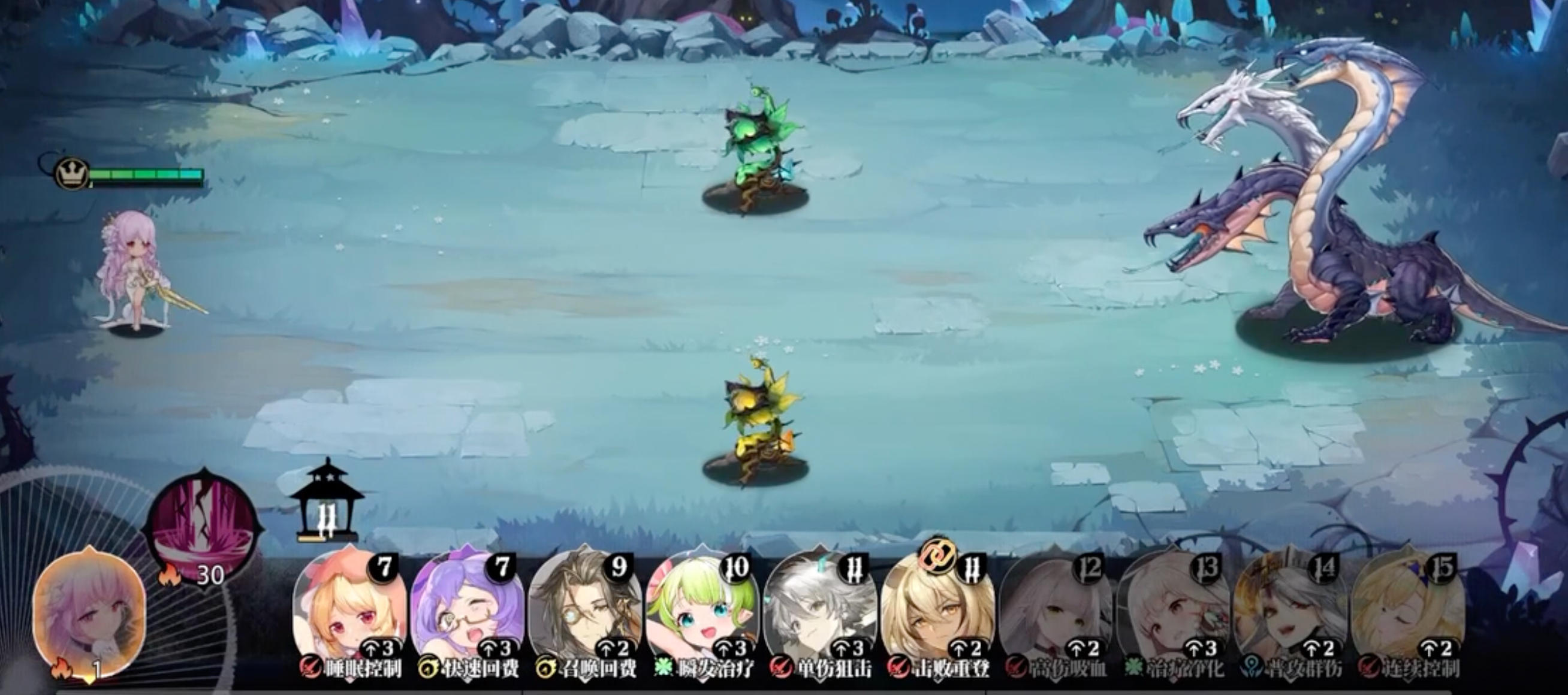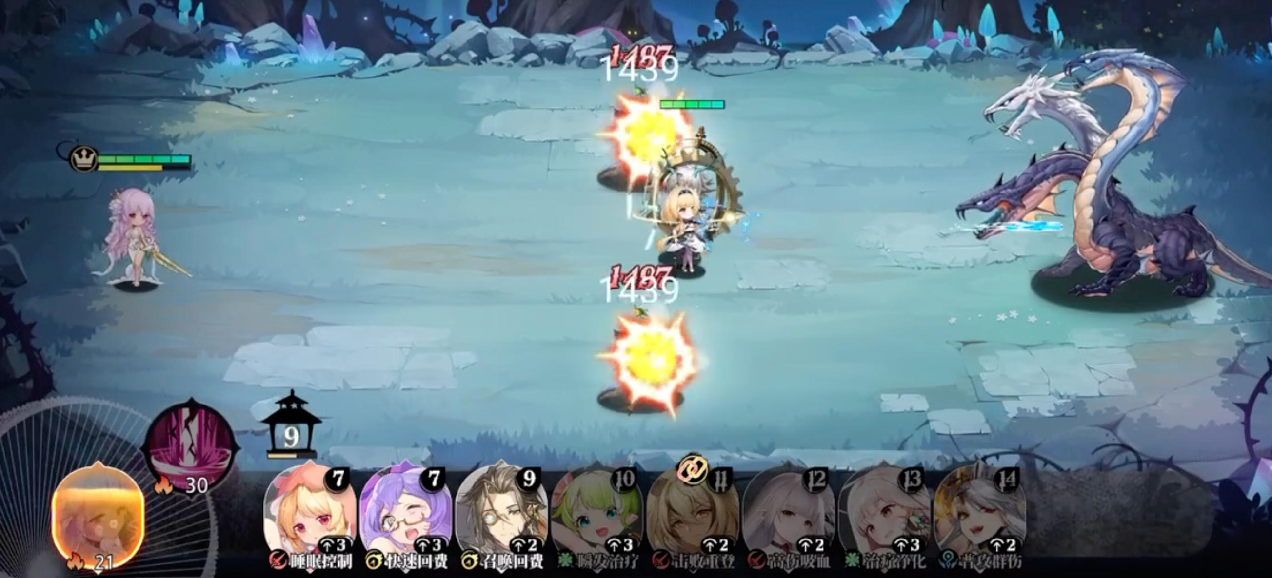 【鬼魅身形】:战斗开始时自动获得最多5层【魅影】状态,每层提供+2%速度加成与+2%闪避率。这一机制使她在开局阶段即可建立行动优势,同时提高生存能力。但每次受到攻击都会失去一层【魅影】,因此操作时需注意进退时机。技能升级后,初始叠加层数增加,整体灵活性和战场适应性大幅提升。