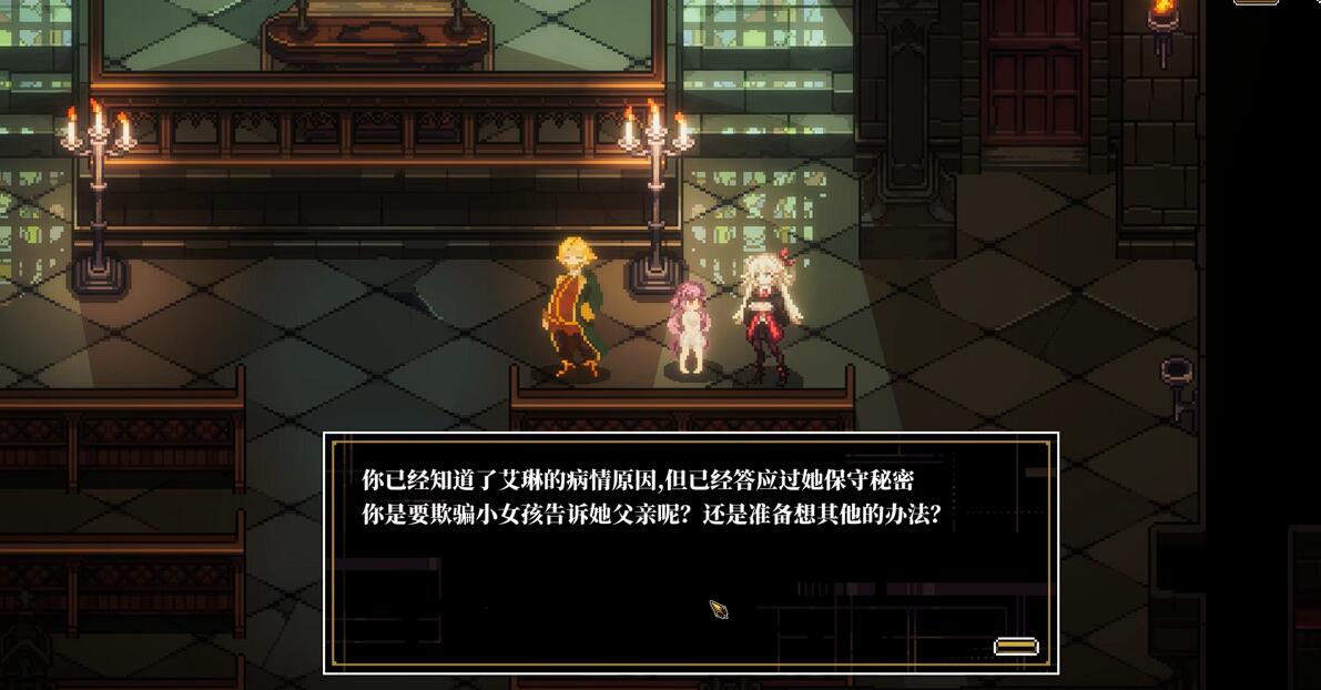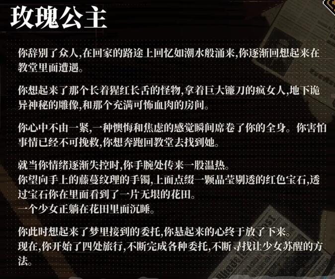 哚哚线(玫瑰公主结局)需在与富豪谢尔曼对话时选择掩护,罪律室被触手拉拽时放弃抵抗以获得服食灵药特质(战斗后自动回血)。被哚哚送出教堂后,贿赂右下居民获取火药,返回地下室神父处拿十字架,调查原珠子位置触发传送即可解锁结局。