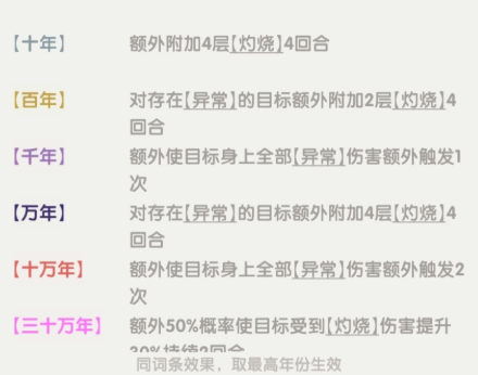 这个神器在10年的时候达到的效果是额外附加4层灼烧,在百年的时候可以对异常目标附加两层灼烧,触发的效果还可以持续4个回合,在技能前摇的时候,可以额外使敌人身上所有的异能伤害额外再次触发一次,在万年的时候如果敌人身上还是有异常目标的话,还可以额外增加四层灼烧的效果,10万年的时候,可以使敌方身上所有的异常伤害额外触发次数达到两次,在最厉害也就是30万年的时候,有50%的概率会使敌人受到主伤伤害提升30%的数值,而且这个效果持续回合也是比较长的。