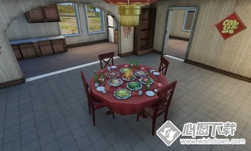 在春节1月28日-2月10日期间,会在海岛地图上刷新10个可以进行“团圆年夜饭”的地点,进去之后可以看到一个桌子,丰富的菜肴,靠近之后可以点击吃饭,还有端碗吃东西的动作。