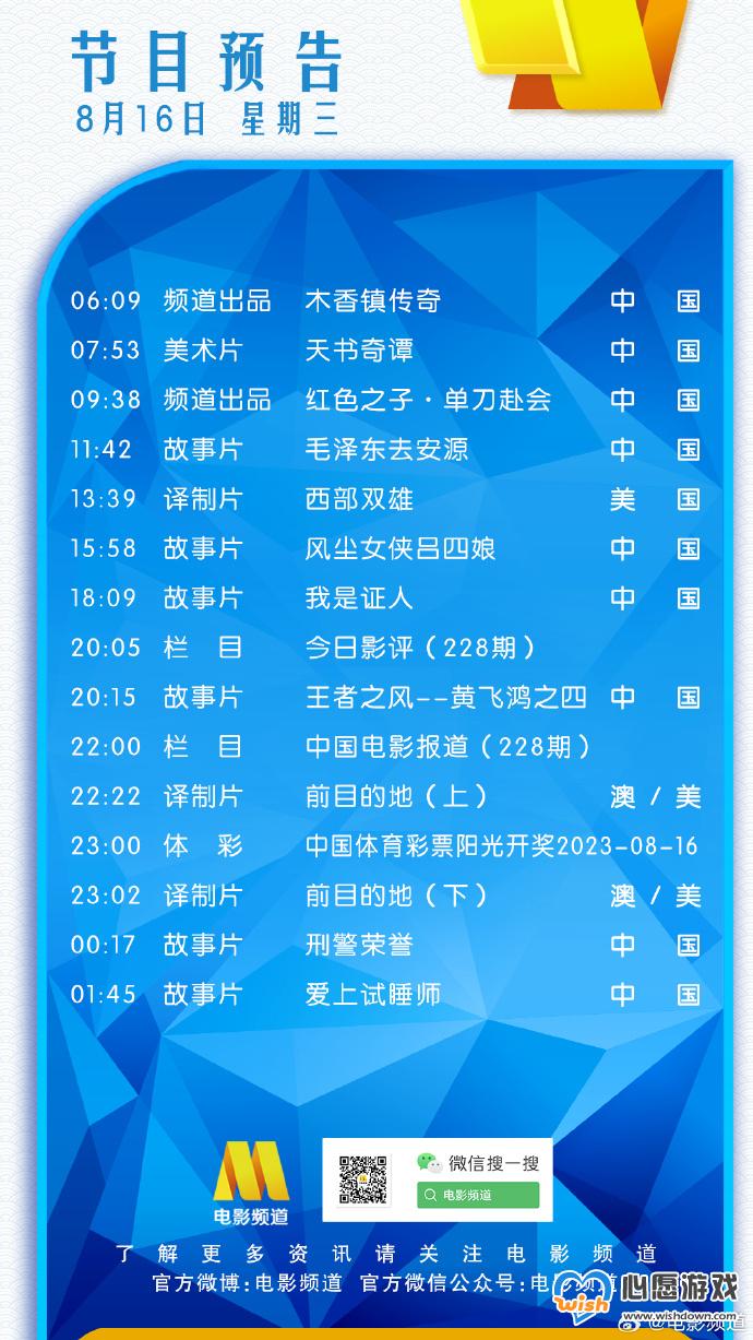 最后:上面就是心愿游戏的小编为您带来的电影频道节目表8月16日 CCTV6电影频道节目单8.16,希望有帮到小伙伴们,更多相关的文章请收藏本站。