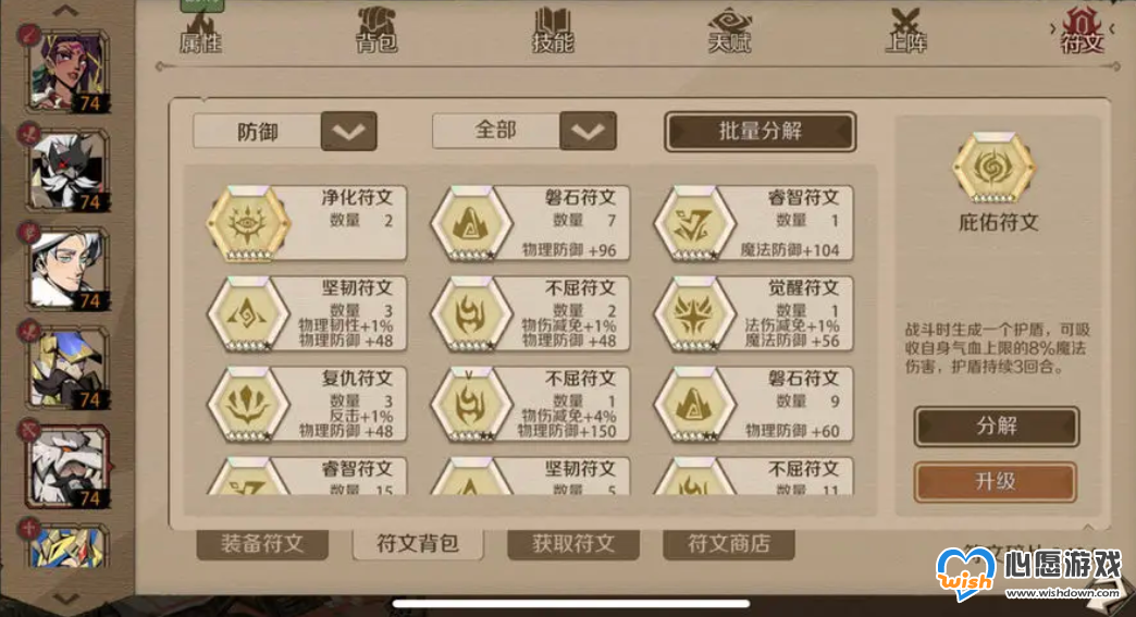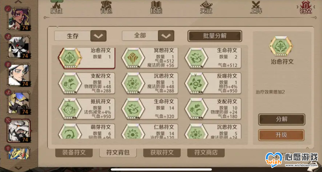 11.以上介绍为普通符文,普通符文最高5星。符文升级不会提高星级,只会提高数值, 除了普通符文,还有一种特殊符文为6星符文,一个人物最多携带4个6星符文,同意分为攻击、防御、生存、辅助。