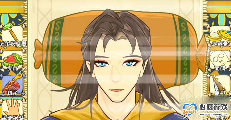 1、西游梗传苦旅美容馆,需要为师徒三人进行美容,首先选择手部按摩 ,在角色下半张脸部进行上划操作