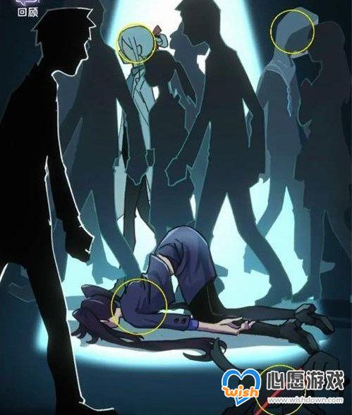 1、场景一:前方倒地的完美小姐、下面狗狗脖子上的红色编织绳、左侧白发女生、右侧角色身上的斗篷。