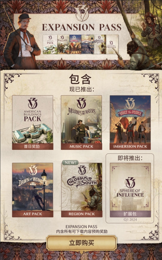 《 Colossus of the South》将免费提供给拥有《维多利亚3》Grand Edition或Expansion Pass的用户,同时它可以预购并被单独购买,建议零售价为5.99美元/4.99英镑/5.99欧元。