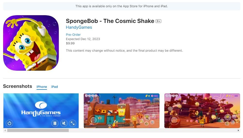 《海绵宝宝:宇宙摇摆》即将登陆移动端 售价10美元