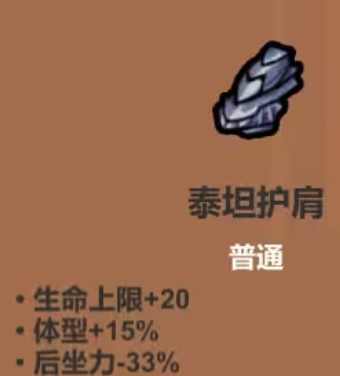 泰坦护肩作为生存向遗物的典范,其价值体现在对脆弱期的强力守护,当角色血量见底时,这件装备提供的巨额生命上限加成还是很有用的,而体型增大带来的视觉压迫感虽可能略微影响弹幕躲避,尤其适合那些依赖近战输出却常因走位失误陷入险境的玩家。