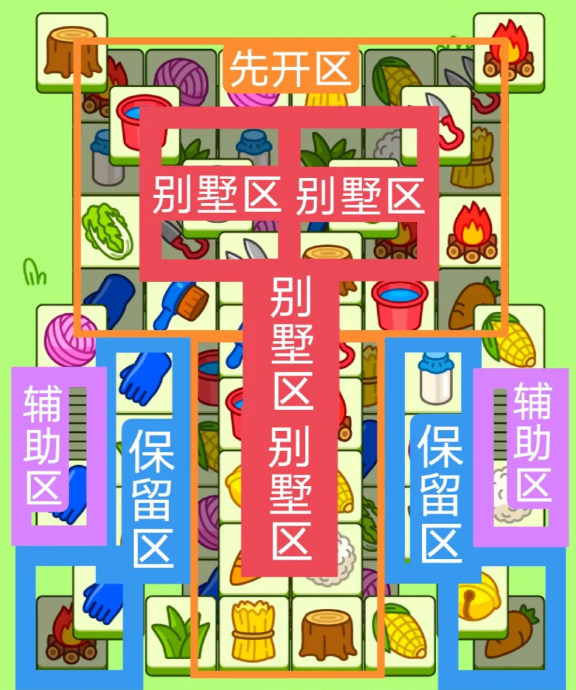 两个方形大别墅,两个长形大别墅。开局先消除橙色区。然后按照一层层均匀消除表面牌。哪里压牌比较多就先消除哪里。必要时可以用盲盒区辅助消除表面牌。尽量还是以别墅区互相消除为生。蓝色区有叠牌,但是不多,全部保留到后期使用。