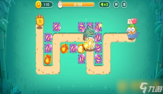 4、可以看到,兔子会爆出很多飞行兔子,我们需要更多的导弹塔,在路的转弯处放两个火瓶。