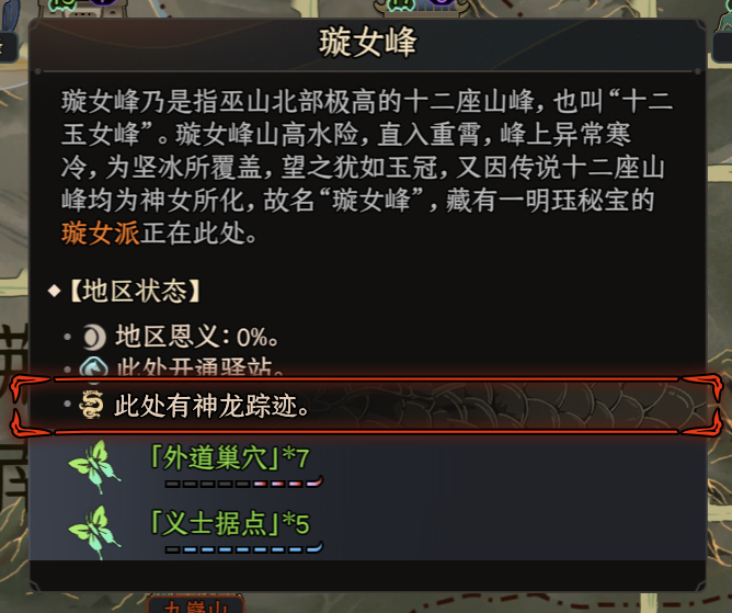 神龙盘踞的地区,虽然资源异常丰富,却有额外的特殊效果。太吾身在其中,若无“蛟鳞衣”加护,则会对自身造成额外伤害。