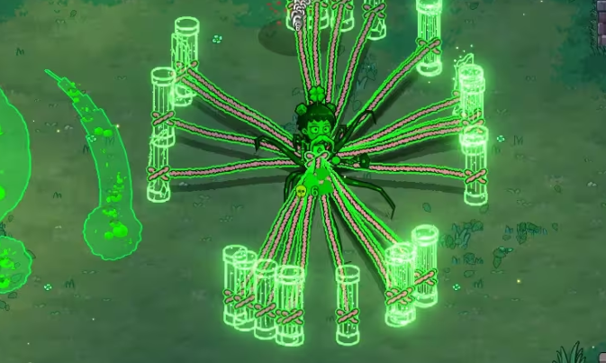 倘若将光柱、脐带和闪电疾行搭配在一起,可以组成进阶搭配。其中闪电骑行可以提升角色的移动速度,同时结合光柱的旋转模式,可以实现快速清场。不过想要使用这一组合,前期还需要优先解锁闪电骑行时长强化和基础增伤法术,等到全部解锁后就可以搭配使用。后期如果升级到终极形态的话,还可以触发触手矩阵,召唤全屏的畜生,共同攻击。