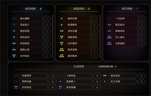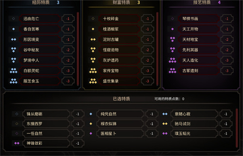2、在特质方面玩家需要在经历特质、财富特质和技艺特质里挑选出10个特质。