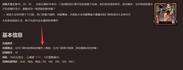 2、其中天下武林大会在每十年的立夏时节举办,出现地点在主办门派对应的城市,例如主办门派是少林派,则会在京城举办。