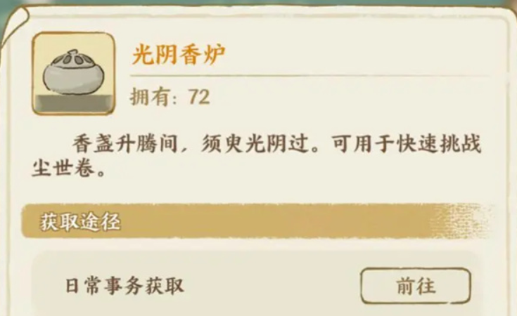 获取完文物之后就可以进行培养,相同的物品可以直接通过升星等方式提升战斗能力,另外玩家也可以参与城市尘世卷副本,获取的各类养成材料,都可以用来提升这些文物的等级,需要注意的是文物会分成四种不同的类型,养成材料也会有四种不同的设定,每个玩家都可以通过这些专属的材料,去提升对应文物的等级,如果对于文物的提升速度要求比较高,那还可以直接用光阴香炉,获得更多的挑战机会,这样就能刷到更多需要的物品,光阴香炉可以通过参与日常任务获取,比如参与逐鹿演武台。
