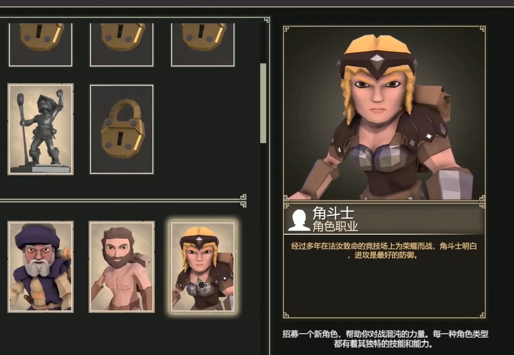 要想使用角斗士这名角色,各位需先在失落的文明剧本中选择炎热土地(或焦干荒地),然后前往竞技场挑战对手,最终在打赢了冠军后,游戏就会自动为玩家们解锁角斗士这名角色,玩家也将在初始角色选择中,能使用她来进行游戏。角斗士的初始属性较为不错,力量、意识、闪避能力都比较高,在前期作战时会有较大的优势,对队友的要求不算特别高,单走能力也强。而且后期配置上合适的养成方向后,也能很好地承担起队伍的输出重任,所以也令这名角色在游戏中较为热门,有不人都会选他。