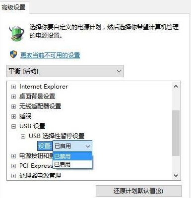 3、展开后找到“USB选择性暂停设置”,然后选择“禁用”