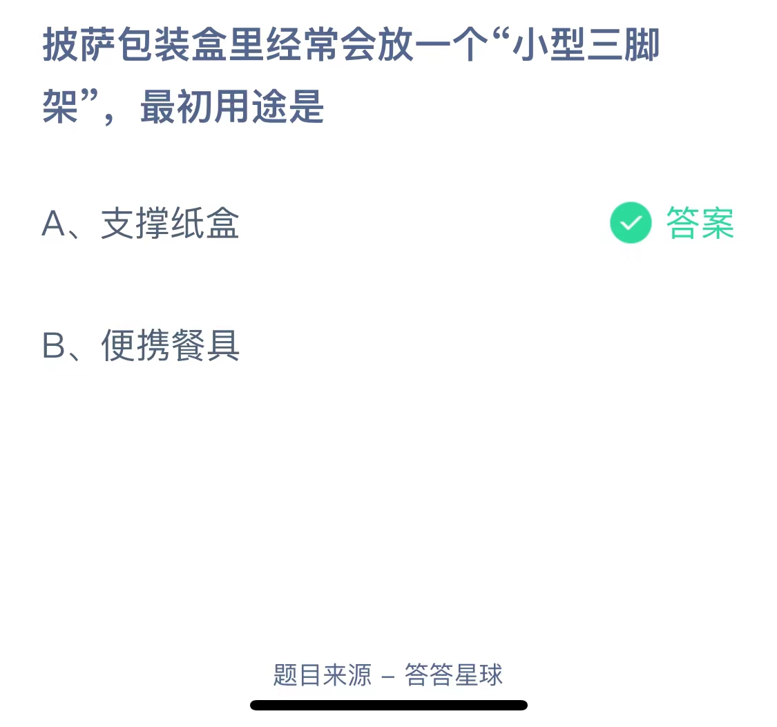 时间:2024-02-02 | 作者: | 阅读:0披萨包装盒里放一个小型三脚架最初用途是?也许很多用户还不知道蚂蚁庄园最新今日答案2.2,下面由心愿游戏小编为你带来答案哦,跟小编一起来看看哦!