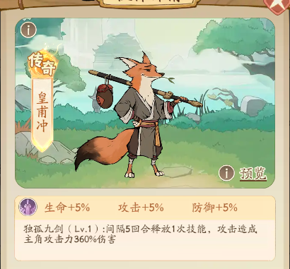 皇甫冲的攻击方式为间隔5回合释放一次技能,攻击造成主角攻击力的360%伤害,最高可造成主角攻击力540%的伤害,由于皇甫冲高额伤害+间隔5回合释放一次技能的特点,因此需要给主角堆闪避属性、减伤生存,使主角在5回合内站住,等到第五回合皇甫冲释放技能,从而最大化伤害。