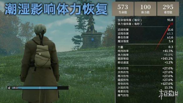 12、玩家在下雨时探索或者游泳都会积累潮湿值,同样有两个阶段,不过影响的是体力恢复值,玩家感受起来不是很明显。