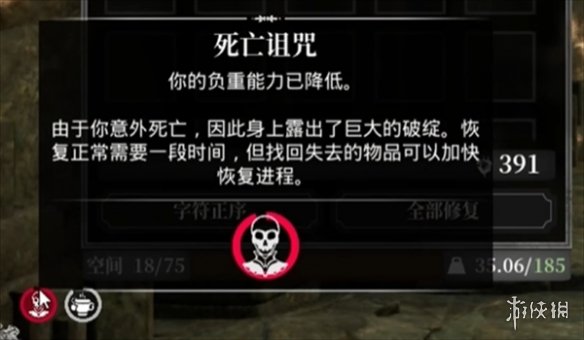 4、死亡诅咒会让玩家角色负重能力降低,玩家无法清除掉,只能等待持续时间结束或者前往死亡点拾取物品来减少持续时间。