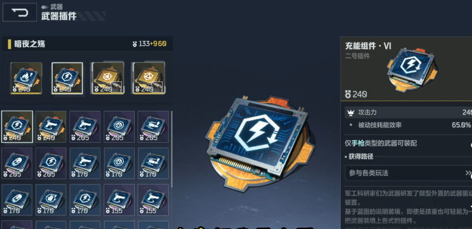 第2个那自然就应该选择充能组件,在实际战斗中,充能组件就是保障持续输出的关键。作用是迅速的加快手枪技能的充能速度,或者是在使用主动技能之后就能迅速的恢复充能条。例如可以造成高额伤害的蓄力射击,在有了充能组件之后,就可以有效减少技能的真空期。让玩家在攻打boss阶段就可以频繁的打出高伤技能,并不需要因为充能慢而浪费不必要的输出。