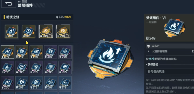 第1个必须要搭配的自然就是焚烧组件,核心的作用就是火焰伤害增加幅度。简单来说是给手枪的基础伤害额外的叠加一些火焰属性的伤害。而且并不是单纯的加一点,而是针对火焰伤害部分就会有较快的倍率提升。玩家在猎场打boss时,火焰伤害就可以持续的作用在boss身上,哪怕只不过是短暂的停火,火焰燃烧效果还是可以继续的掉血,就相当于可以多一层持续输出的buff。