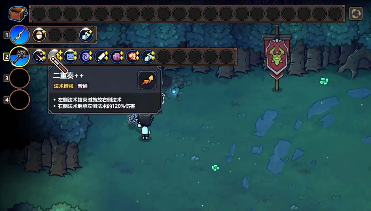 二重奏的效果简单总结起来只有两点,一是放在二重奏左侧的法术在完成施法后会立刻释放二重奏右边的法术,二是二重奏右边的法术可以继承左边法术一定比例的伤害,因而从逻辑上来看,颇有种能让两种法术实现左脚踩右脚神奇机制。在这样的情况下,各位完全可以利用二重奏的特性,来优化法术构建,令法术拥有更好的操控手感和更高的伤害。下面就带各位了解下二重奏的具体用法。