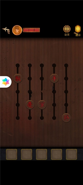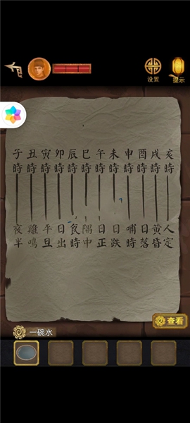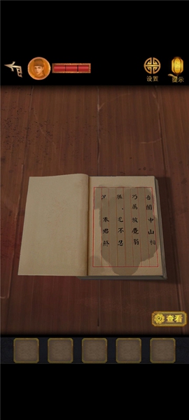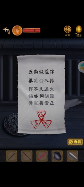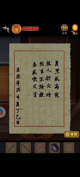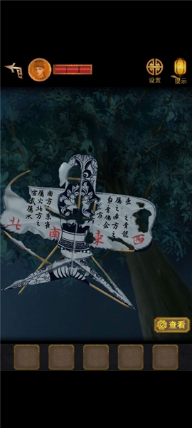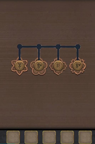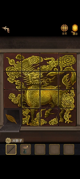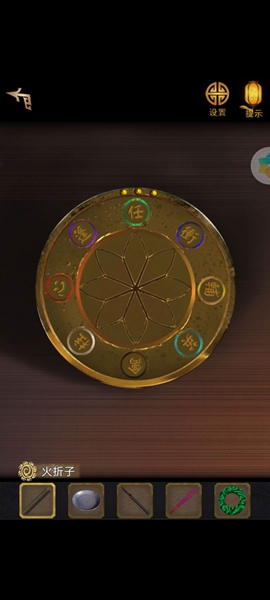 3、然后移动凳子,将点亮的灯笼挂到右上方,看到木头上有字符,根据左右字符调整机关,获得玉佩。