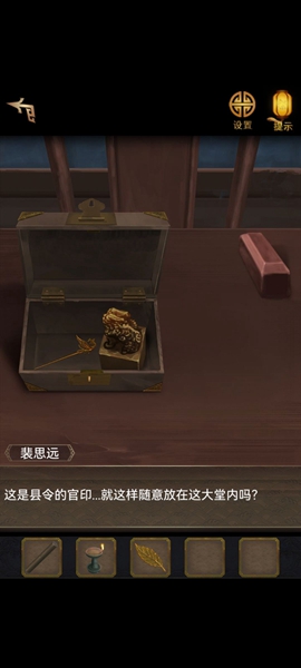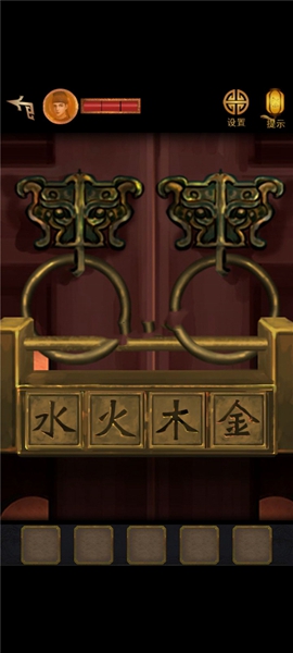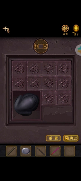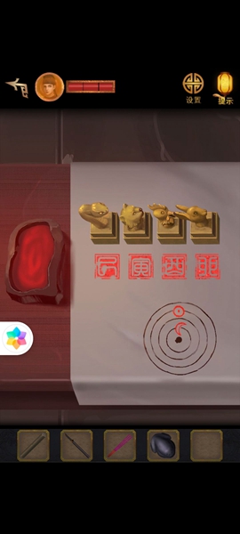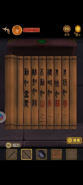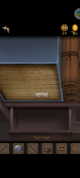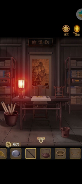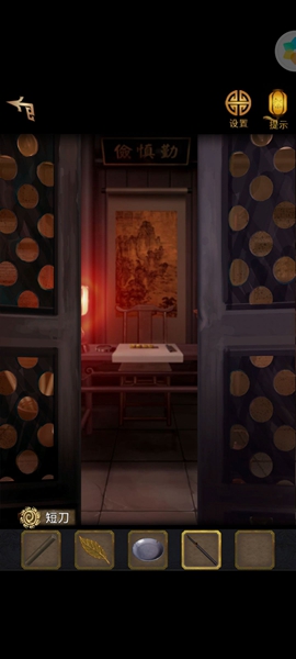 11、用铡刀切开里面有【寿字铜纹】,两个都放到带凹槽的柜子上,打开里面有【铜方块】,根据木牌和书的提示调整位置,获得【铜钥匙】,用钥匙打开常宾的家。