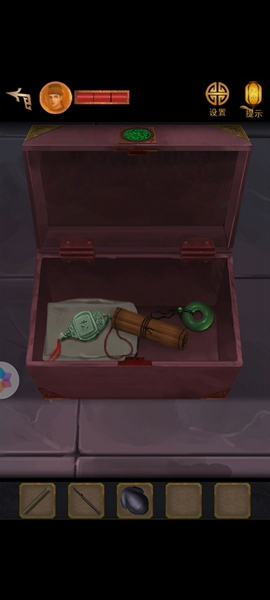 2、接着出门右转捡到香包,里面有小钥匙,拿着钥匙回去开箱子得到钗子。
