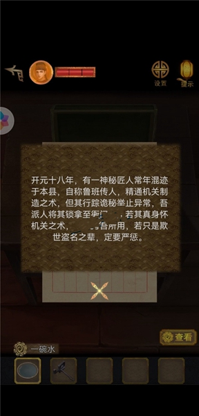 1、让四个齿都不被卡住才能解锁左侧门上的机关锁,打开茶馆门,探索后得到一根筷子。