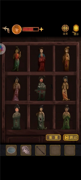 16、密室门开启后进去,打碎玻璃箱子,得到土偶,摆上去后得到对应纸条的提示。