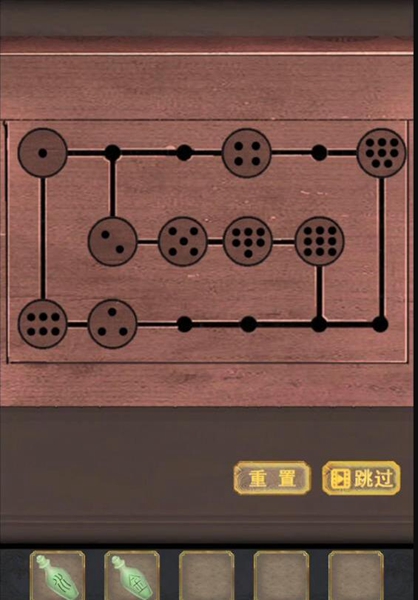 14、在桌上完成猜牌游戏得到【瓷瓶-火】【九点骨牌】,鞋子里找到【三点骨牌】,抽屉里【五点骨牌】。根据窗帘的提示在下方放上骨牌调整到下图的样子,获得【圆形木板】。