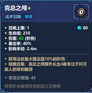 如果没有搭配融合召唤,克总之颅就只能靠自身的四条触须,针对敌人造成持续性伤害,并且召唤的上限也只有一。但如果是加入融合召唤,就可以直接解锁一个双头的形态,触须的数量就可以提升到8条。另外还可以激活一个精魄的效果。最终的形态就会变成一个16手臂的配置,会有效提升攻击的频率,还有覆盖的范围。秒杀的数值就可以直接突破27,293点可以轻松的应对比较多的敌人。