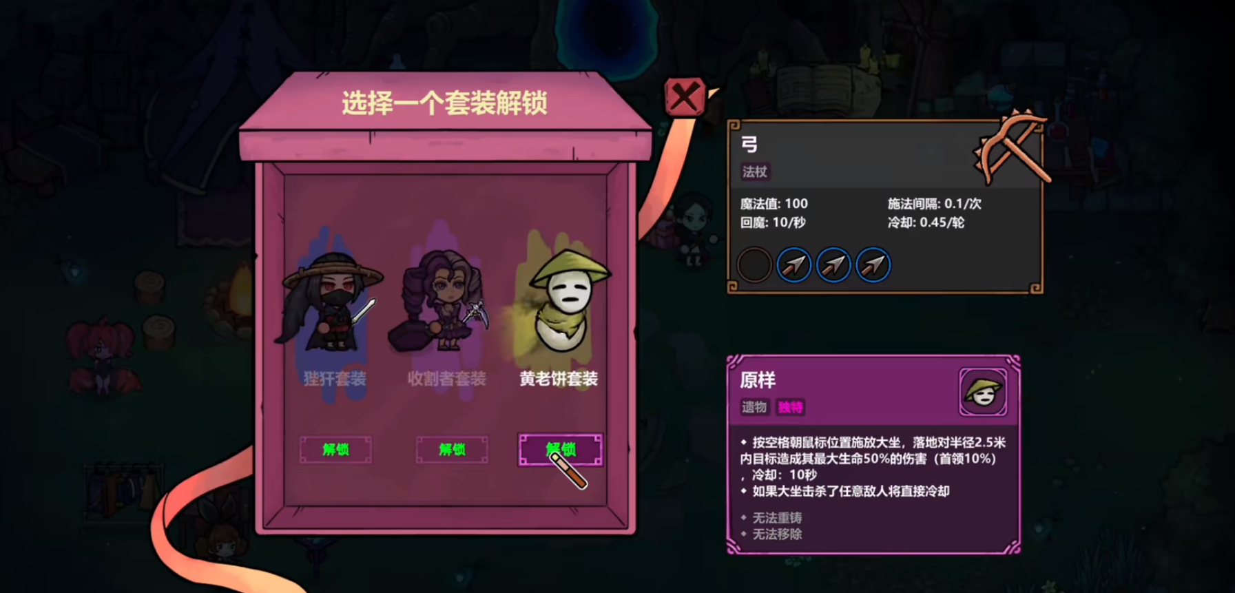 黄老饼的套装搭配主要是以法术特性和独特技能为主,可以在实战时达到高效的输出能力和连招制裁。黄老饼的技能“大坐”可以对范围内的敌人造成最大生命值的百分比伤害。同时搭配遗物“近距离观察”就能准确知道斩杀线,从而实现无限连坐。当套装完成升级之后其伤害百分比也会随之增加,攻击范围也会扩大,而且还会减少冷却时间,再搭配上遗物“冷却剂”就可再一步减少冷却,提高连招频率。