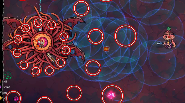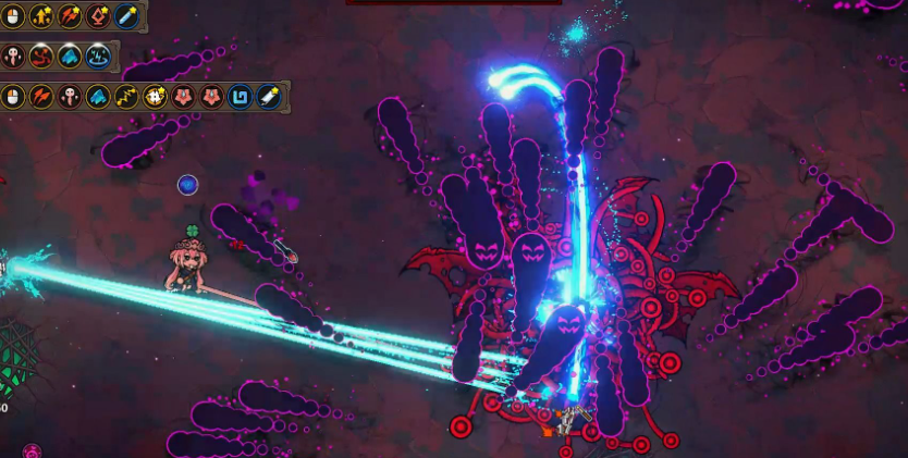 第二种行动模式是召唤蚯蚓,蚯蚓血量不高,只需要快速清除即可。第三种技能是发射紫色光线,这个技能想要闪躲起来还是很困难的,不幸被击中的话,会导致人物角色移动方向发生紊乱。第四种技能为半狂血状态的360度释放圆圈,而这个圆圈还会逐渐增大,想要得到也有一定难度。想要胜利通过最后一个boss,主要看的就是输出,输出较暴力的话,会很快打掉boss的血。