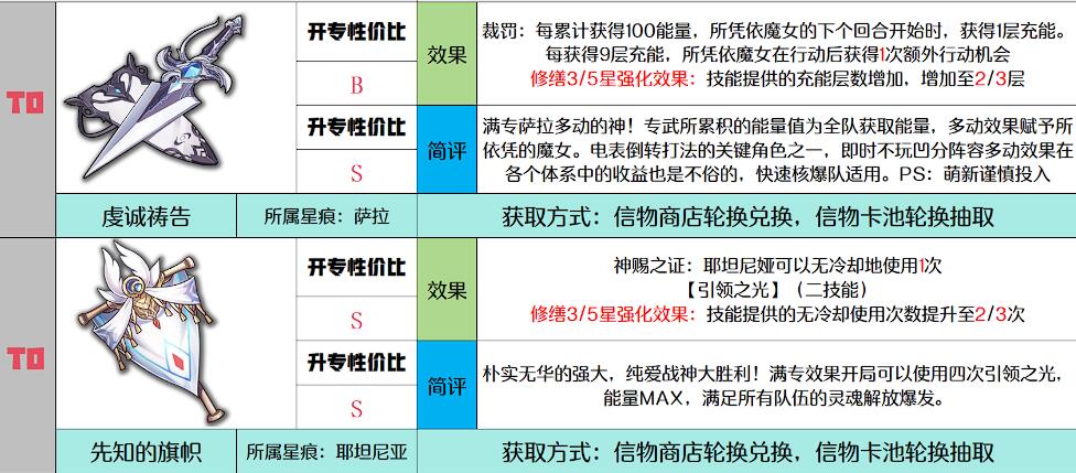 T0级信物具备跨体系适配性,是各流派的基础配置,虔诚祷告(萨拉)累计100能量即可获得充能,3星和5星时充能层数分别增至2层和3层,适配所有需要能量循环的队伍、先知的旗帜(耶坦尼娅)能无冷却释放引领之光,满专精可释放4次,大幅提升队伍辅助能力。这类信物优先级最高,可作为长期养成目标。