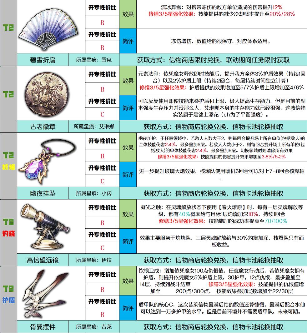 T2级信物仅适用于特定场景,泛用性较低。如碧雪折扇(雪泉)对带伤敌人增伤12%,仅推荐在冰冻队需要补充伤害时使用。其强度定位清晰,优先级低于T0和T1级,可在后期阵容完善后酌情配置。