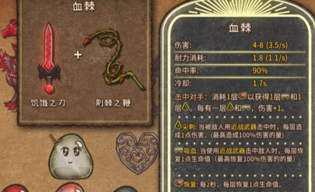 合成的物品会因为合成的步骤不同而得到不同的武器,玩家们将饥饿之刃与荆棘之鞭相融就会得到血棘,血棘可以在对敌方发起攻击时对敌方造成吸血效果,在被敌人击中的时候,会叠加恢复层数,当层数增加时,玩家们会逐渐增加攻击能力,这个能力属于‘尖刺’,而在攻击敌方获得的吸血效果的则是‘吸血’。