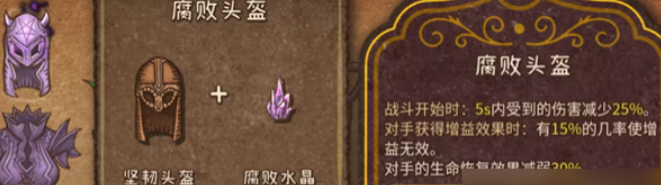 腐败头盔主要的品质是传说型的头盔,它可以对敌方造成减少增益效果,让其的生命恢复效果直接减弱30%,并且它还有15%的几率使对方获得的增益变无效,在对局刚开始时玩家们在前五秒内的受到的攻击会直接减少25%,是一个防御效果和增益效果都非常突出的装备。