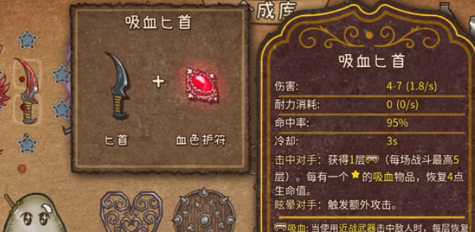 吸血匕首属于近战武器,玩家们在攻击敌人的时候也会获得吸血效果,并且每层恢复一点生命值他拥有额外的攻击效果,可以直接眩晕对手,当玩家们击中对手的时候,会获得一层吸血,在每一场的战斗中可以获得最高5层吸血效果。当玩家们本身拥有吸血物品时会恢复4点生命值,冷却时间只有3秒,命中率高达95%,伤害主要是4点~7点,是个不错的武器。