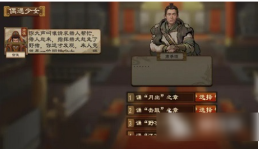 主角为了创立和巩固基业,时不时就要外出,去往很多城池或其他地方,时不时就会偶遇少女,接着就要回答问题,选出最恰当的答案。当需要渡船时,会有少女前来帮忙,这时候最正确的选择便是“柏舟”;上山碰到采药少女后要选择的是“蔓草”;如果碰到的是牧羊或者浣纱的少女,那么就要选择“月出”;如果需要一位会划船的少女帮忙,就要选择“蒹葭”。