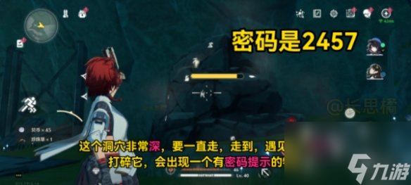 2、这个地下洞穴非常非常深,走到这个大石头这,摧毁这个石头就可以看到一个信息触板,它会提示密码,2 4。