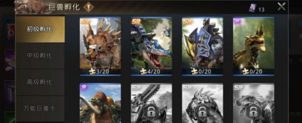 在巨兽孵化的界面中,可以看到在上面的位置都是通过同一种恐龙的碎片进行合成的,合成的条件还是说比较困难的,这时候我们点击到最下面的位置,就能够看到万能巨兽卡的界面了,我们在这个位置,是可以使用我的R级万能卡的,但是其实除了R级还有SR和SSR级别的万能卡。