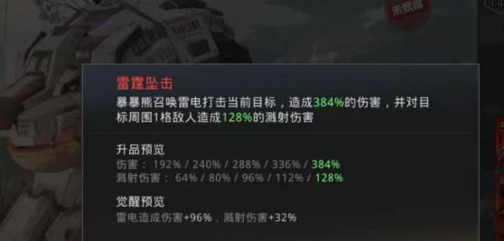 爆爆熊的天赋技能是战熊意志,效果是提高了暴暴熊的普攻伤害,但是移动速度降低,移动速度减低对于输出来说影响并不大,因为暴暴熊本来也不是擅长位移的巨兽。主动技能雷霆坠击,效果是可以召唤出雷电来攻击,对目标造成高额伤害,然后在造成一次溅射效果,所以对于站位比较密集的敌人伤害很高。技能雷熊附加的效果是在暴暴熊的血量低于百分之三十的时候,双掌附加了雷电能,提高自身的伤害,所以暴暴熊是一个在战斗的最后爆发力非常高的一类。千万不要看着暴暴熊快死了就掉以轻心。