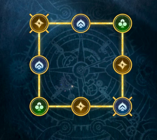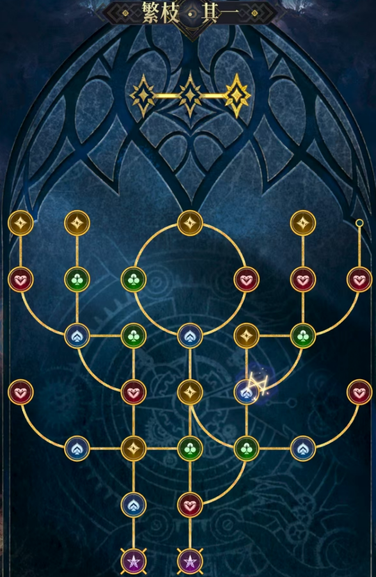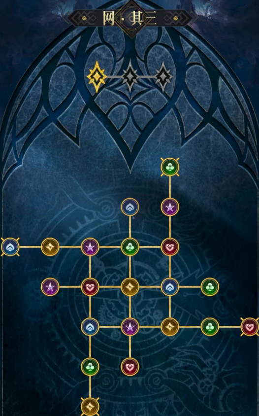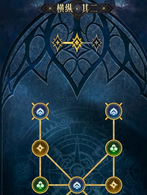 四象调和的活动分为多个章节,玩家在完成前两章后,接下来会遇到更复杂的挑战。前几章的任务比较简单,点位较少,组合关系容易推算。但是随着后续章节的推进,点位数量大幅增加,颜色的组合也变得越来越复杂。比如,在章节“初遇”中,点位的数量少,颜色搭配的关系也比较直观。这个阶段更多的是让玩家熟悉五行相生相克的原理以及如何快速判断一个组合的正确性。然而到了“纵横其一”、“纵横其二”等后续章节,点位数量增多,可能有些点位需要互相配合才能解锁下一关,成功的组合也不再是简单的相生关系,克制关系的使用逐渐成为通关的关键。