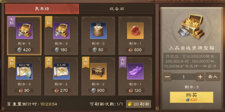 商业系统的引入为资源管理带来了更多的途径,民丰坊中的折扣宝箱如同定期开放的集市,用贡献币换取稀缺资源,战备阁则将战场功勋转化为战略物资,这种虚拟经济与现实战斗的结合,要求玩家必须具备双重视角,既要派部队在外征战获取战功,又要留足人力维护城内经济建设,特别是3折宝箱的出现,往往是扭转资源困局的关键契机,精明的主公会掐准刷新时间,看看有没有捡漏的机会。
