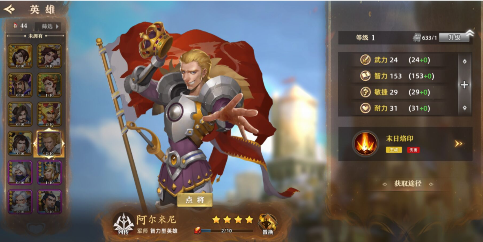 功能型英雄:例如张骞、秦琼、穆桂英这类,有着辅助队友的能力,获得一个军团buff的角色也是非常值得培养的;